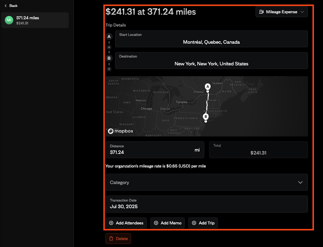 - Category: Select the expense category for this mileage claim.