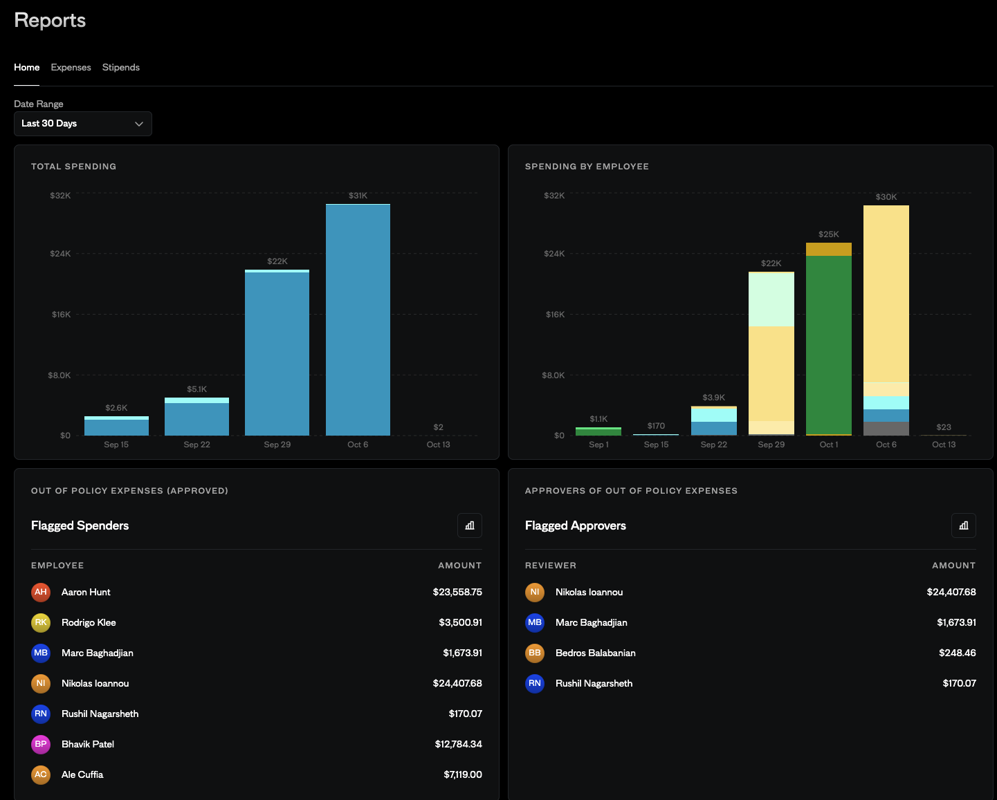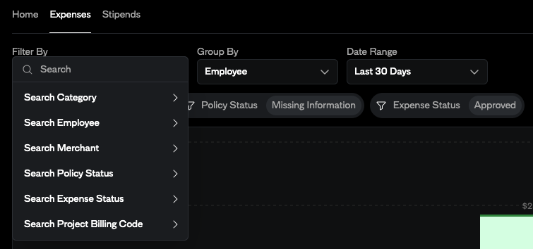 - Expenses Tab: Detailed breakdowns of expense activity by category, date, employee, merchant, and more.