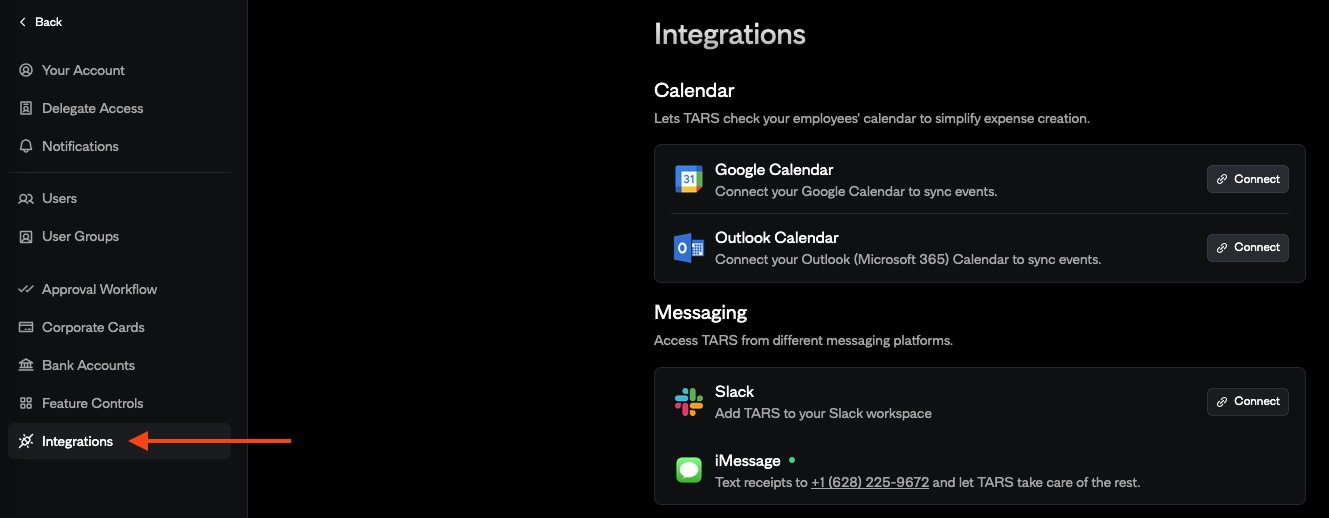 These integrations help streamline the expense submission process by allowing TARS to automatically retrieve contextual details, saving time and improving accuracy.