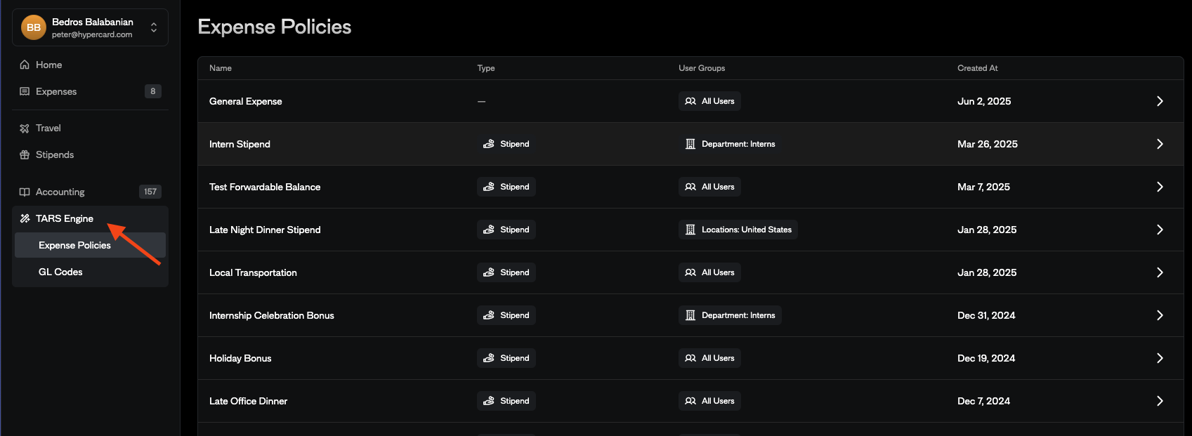- You can also fine-tune expense policy controls so that TARS, Hyper’s AI-powered assistant, reviews expenses more accurately based on your configured GL accounts and policy rules.